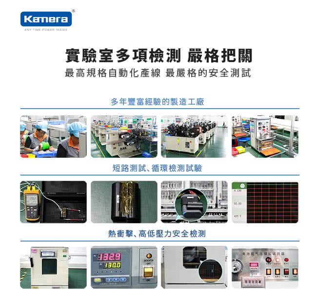 Kamera佳美能2006年開始投入相機充電電池的生產與研發,並於2010年設立全自動化電芯產線,採用高效能電芯自動化電芯產線生產,產品更進口日本IC晶片讓電池本身安全性更佳,出產前也會通過充放電循環測試,確認產品的使用效能;佳美能全系列電池已經投保3500萬產品責任險。